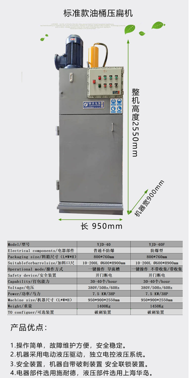 200升大油桶压扁机,也称废油桶压扁机,专为危废铁桶设计,可以用来压缩20-210升的
