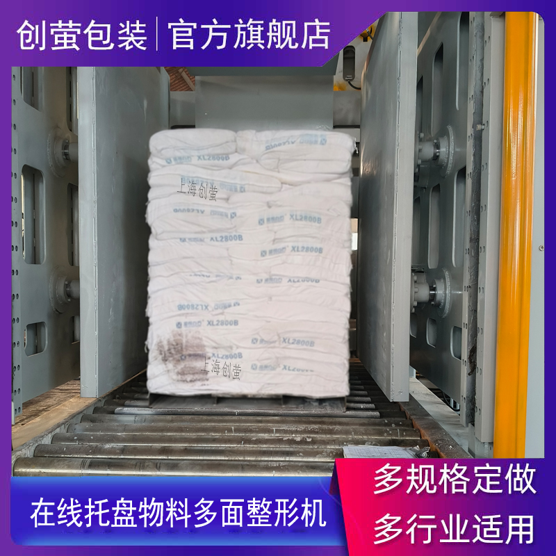 托盘六面整形机机械采用电动液压驱动,PLC自动控制,是将托盘上蓬松,堆放不整齐的包装袋,通过六面挤压,定型,达到托盘上的货物平整,方便装车和运输。