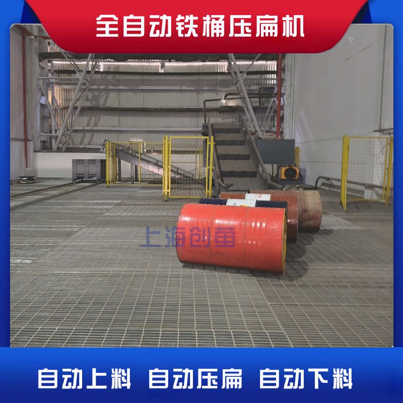 创萤牌全自动油桶压扁机为解决企业堆放难题,和炼钢厂合作生产了全自动在线油桶压扁机,机械采用液压驱动+PLC自动控制,一键操作,自动完成油桶上料--自动放桶--自动压缩--自动出饼--自动收集圆饼等。